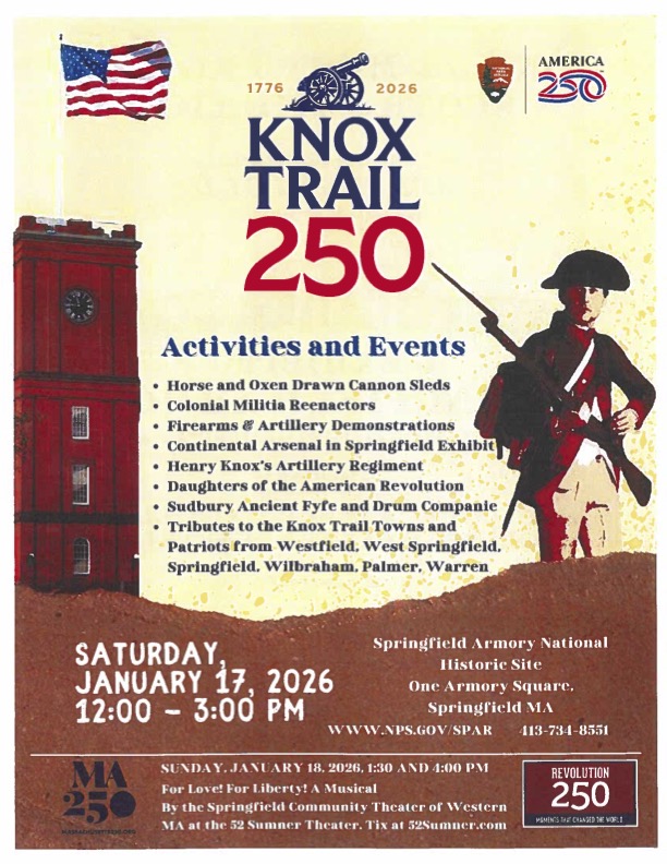 Community & PartnersThe commemoration is presented in collaboration with regional reenactors, historical organizations, and patriotic groups. Special recognition will be given to the Knox Trail communities of Westfield, West Springfield, Springfield, Wilbraham, Palmer, and Warren—towns that continue to preserve and share the history of Knox’s route. The commemoration continues Sunday, January 18th with an original musical production For Love! For Liberty! at 52 Sumner Theater.